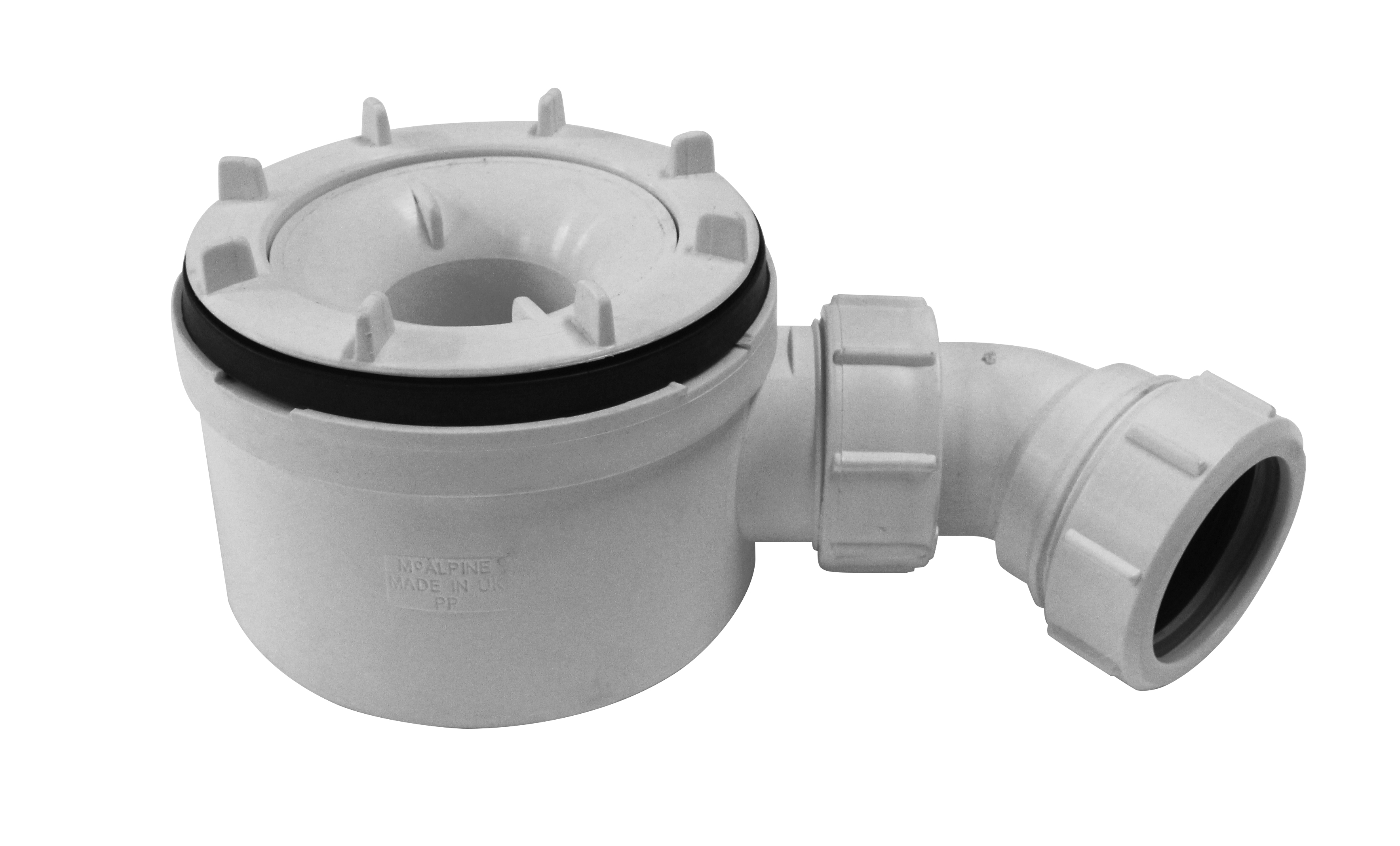50mm Water Seal Trap Body with 1 1/2" Multifit Outlet. Overall height with tile 100mm. Flow rate 34I/min. (Flow rate caculated under a constant 15mm head of water)